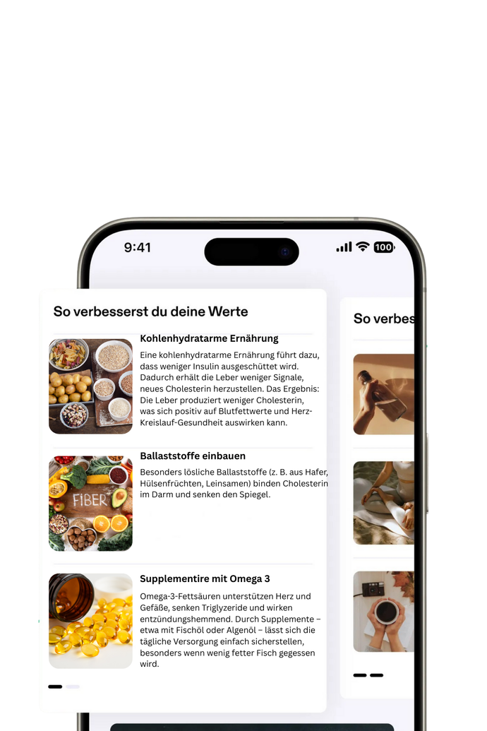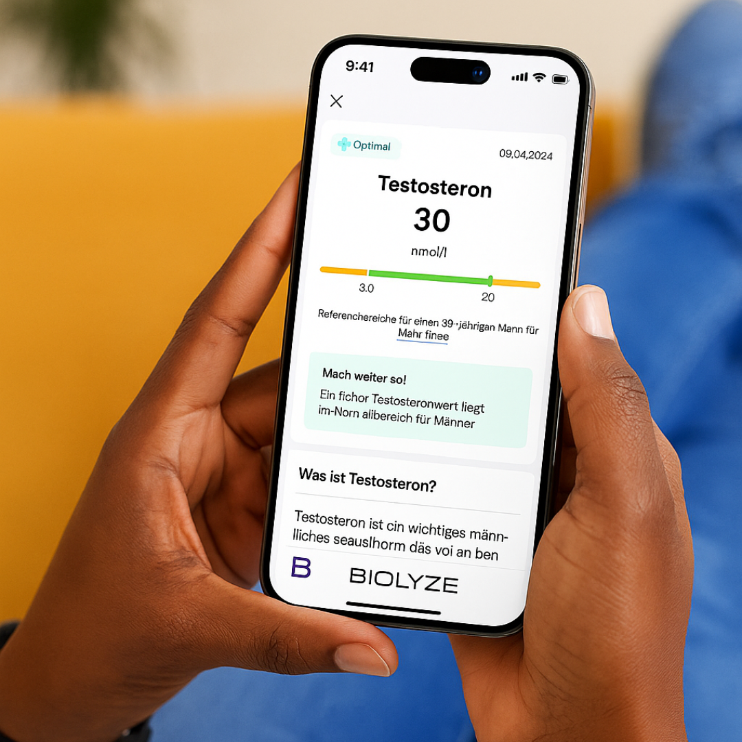 Mit der BIOLYZE App hast du deine Blutwerte jederzeit im Blick. Die KI analysiert deine Ergebnisse, erklärt dir verständlich, was sie bedeuten, und gibt dir konkrete Empfehlungen zu Ernährung, Lifestyle und Supplementen. So verwandelst du Daten in echte Handlungsschritte – einfach, personalisiert und wissenschaftlich fundiert.