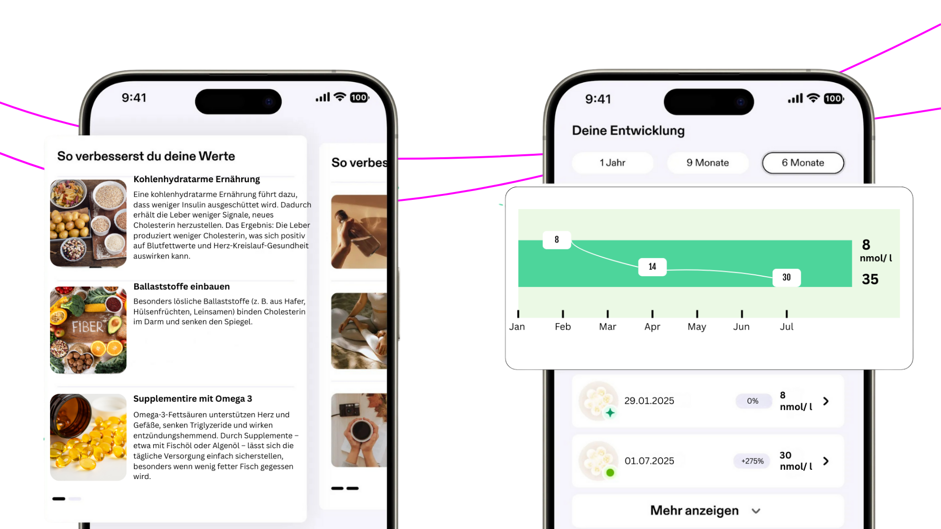 Die BIOLYZE App analysiert deine Blutwerte mit KI, erklärt dir verständlich, was sie bedeuten, und gibt dir personalisierte Empfehlungen zu Ernährung, Lifestyle und Supplements. Mit intelligentem Foreshadowing zeigt sie dir außerdem, wie sich deine Werte künftig entwickeln können – und wie du aktiv gegensteuern kannst.